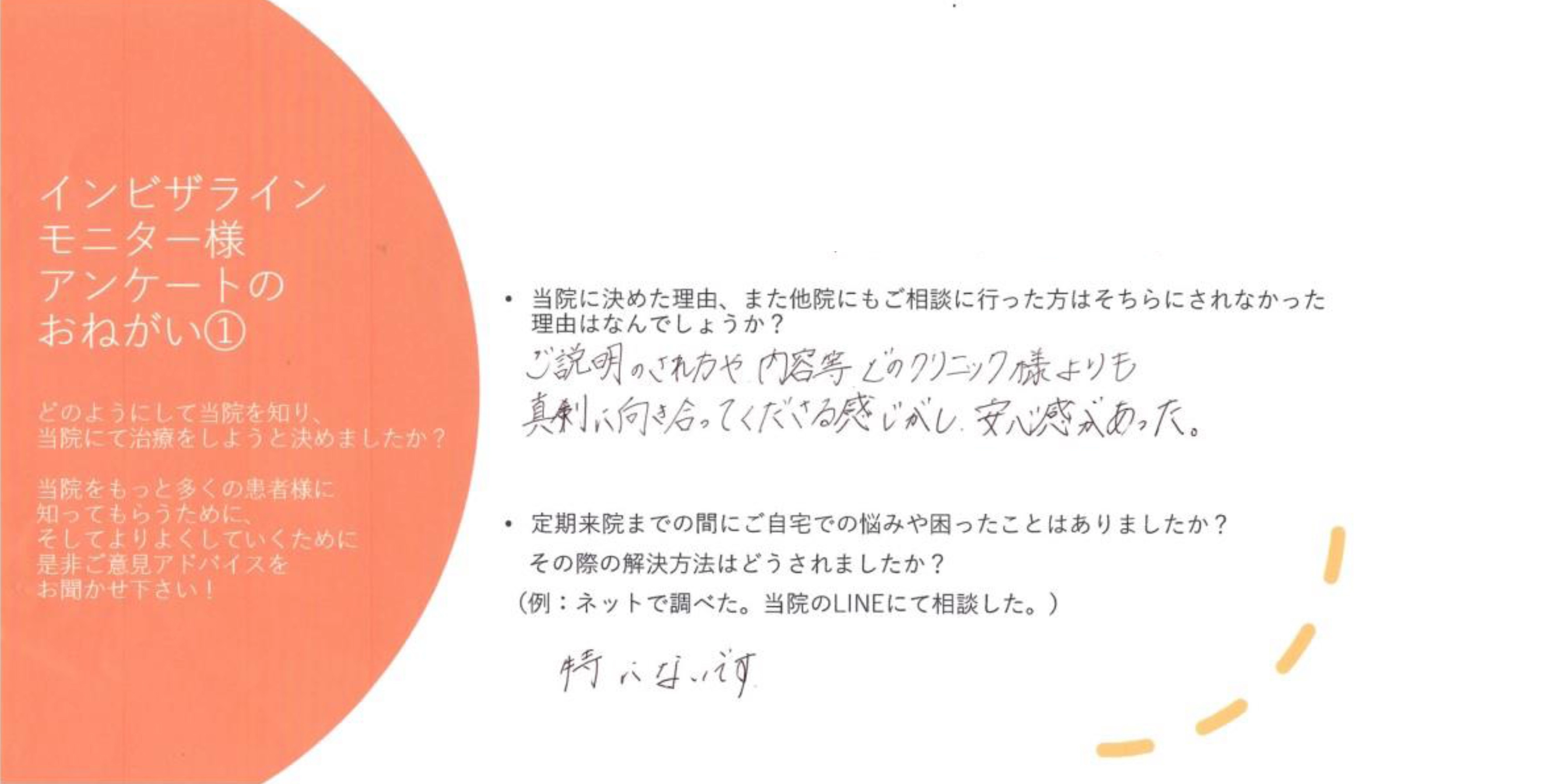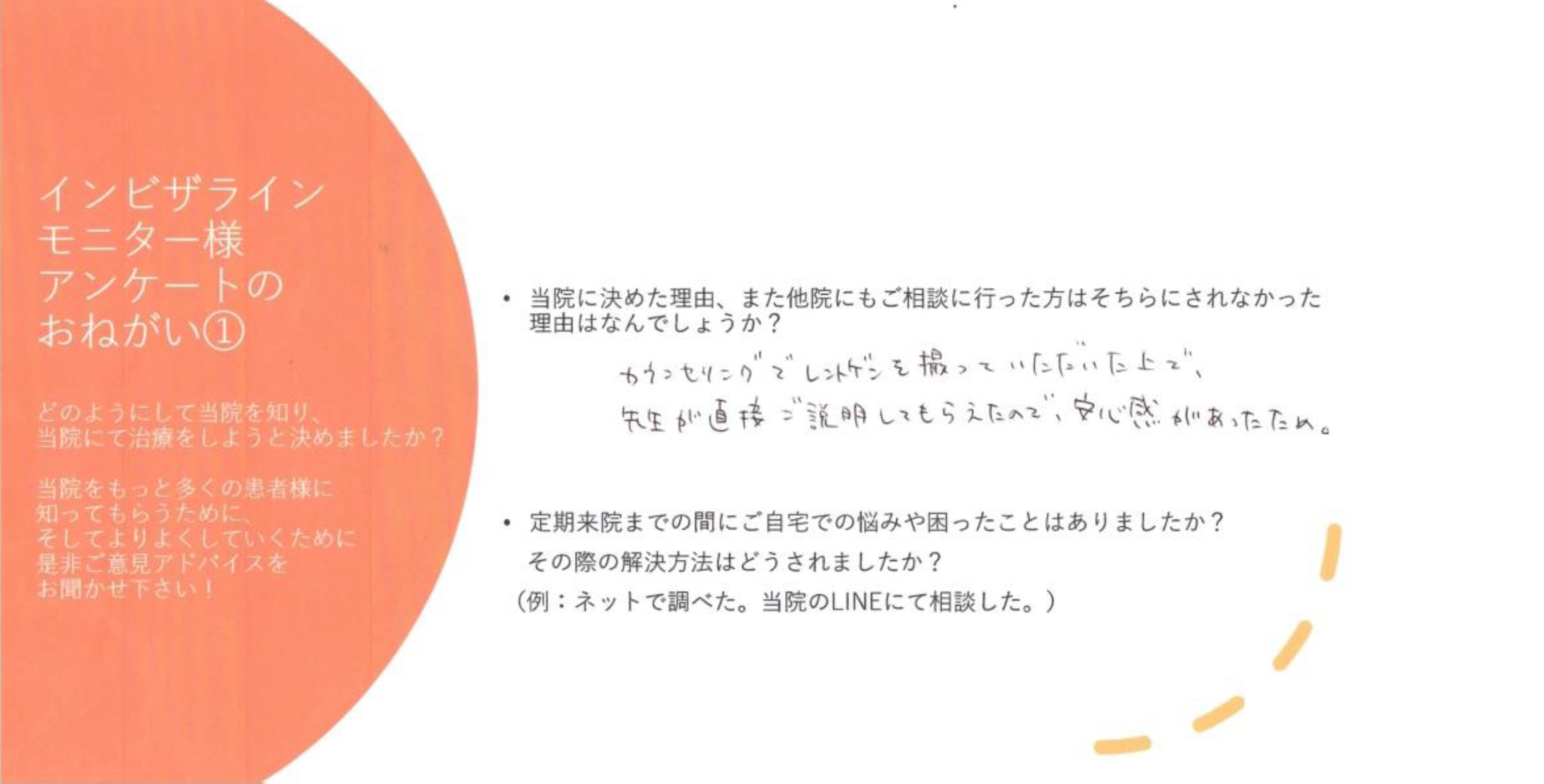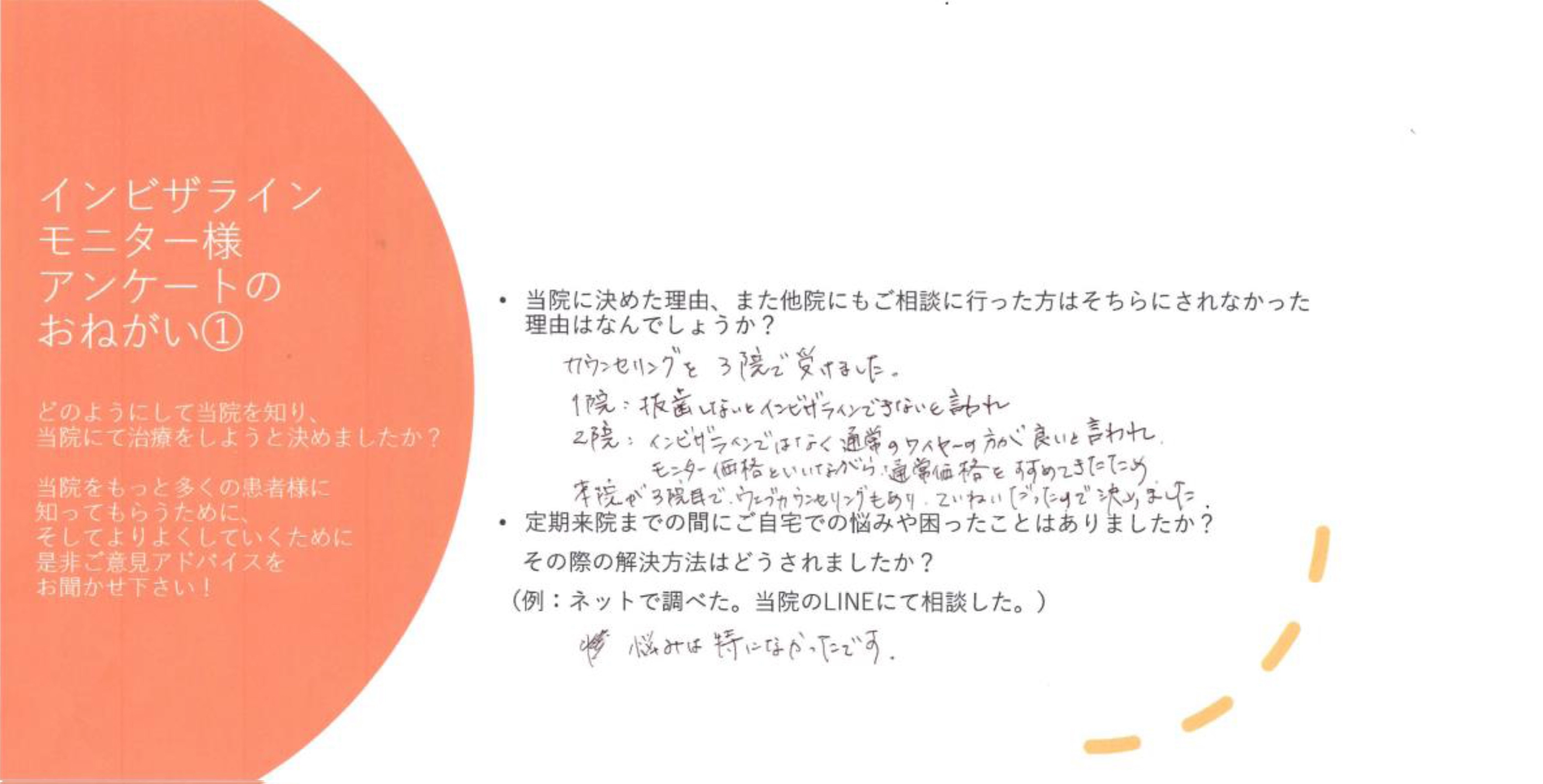 ¥300,000~¥700,000(税別) モニター患者様には、当院ホームページやSNS、院内での他の患者様へのご説明用にお写真をご使用させていただく場合がございます。(顔写真は使用しません) ※抜歯症例でもモニターの対象となります ※骨切り等が必要になる難症例はモニターの対象外となります お電話やメールでのお問い合わせは診断ができません。ご予約後直接ご来院いただき、矯正の診断を受けられることをお勧めいたします。 |