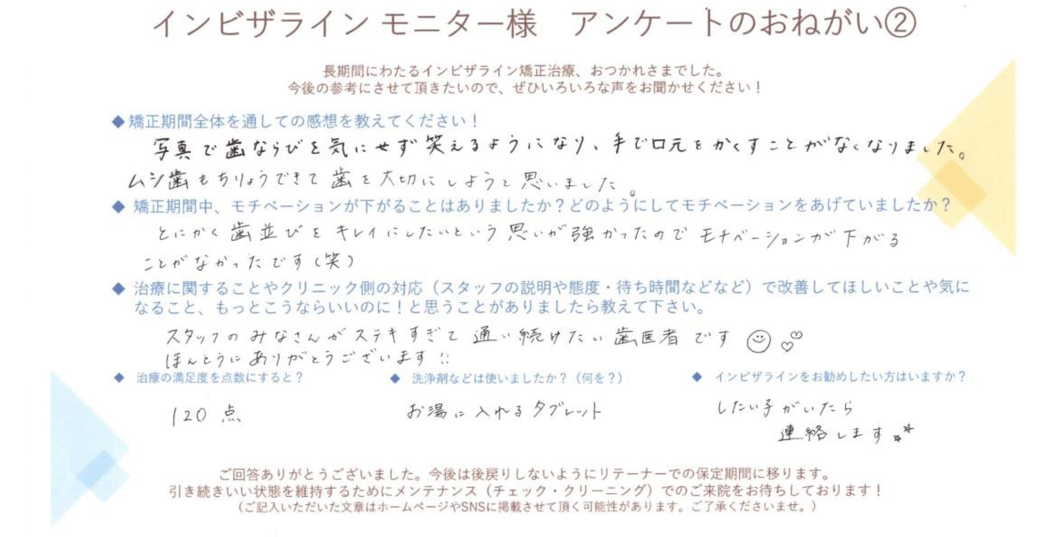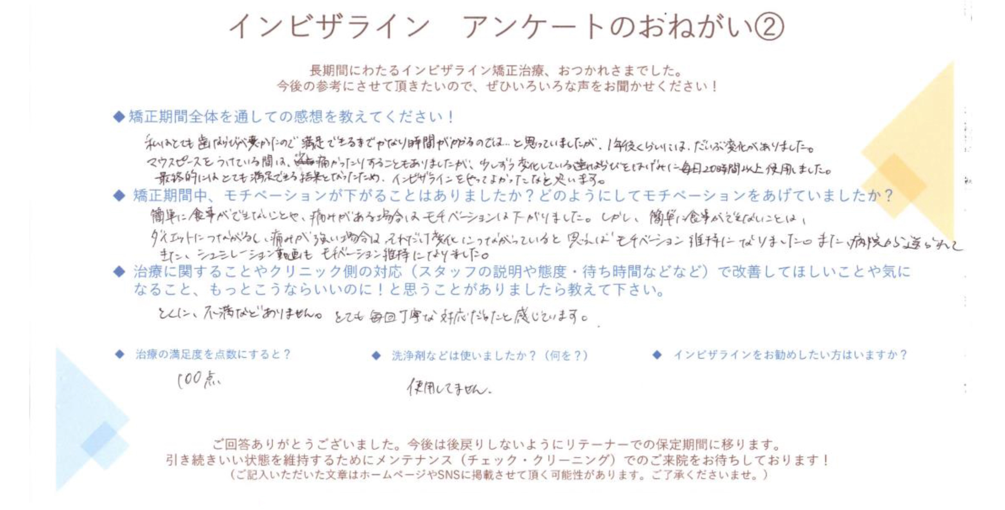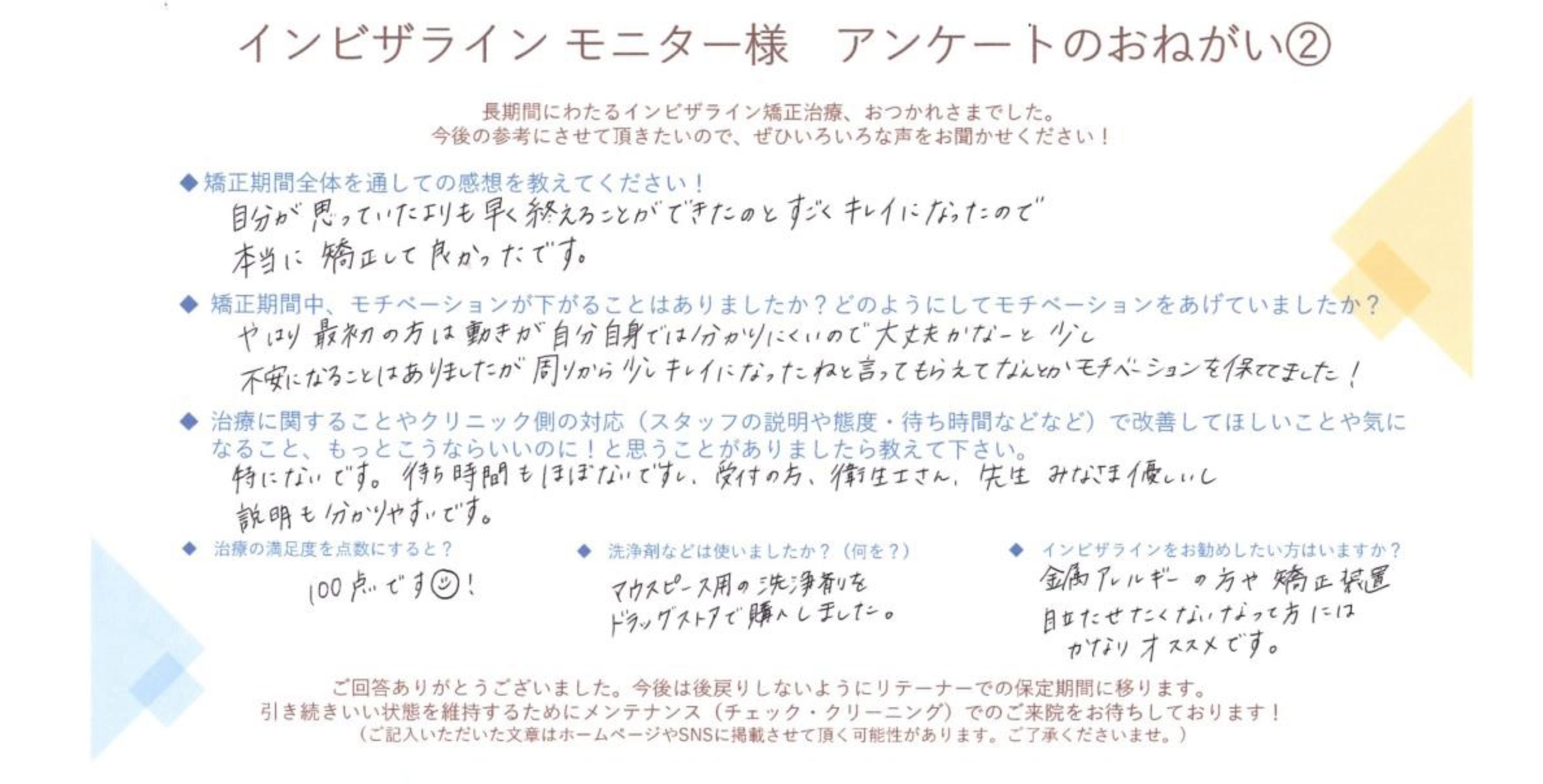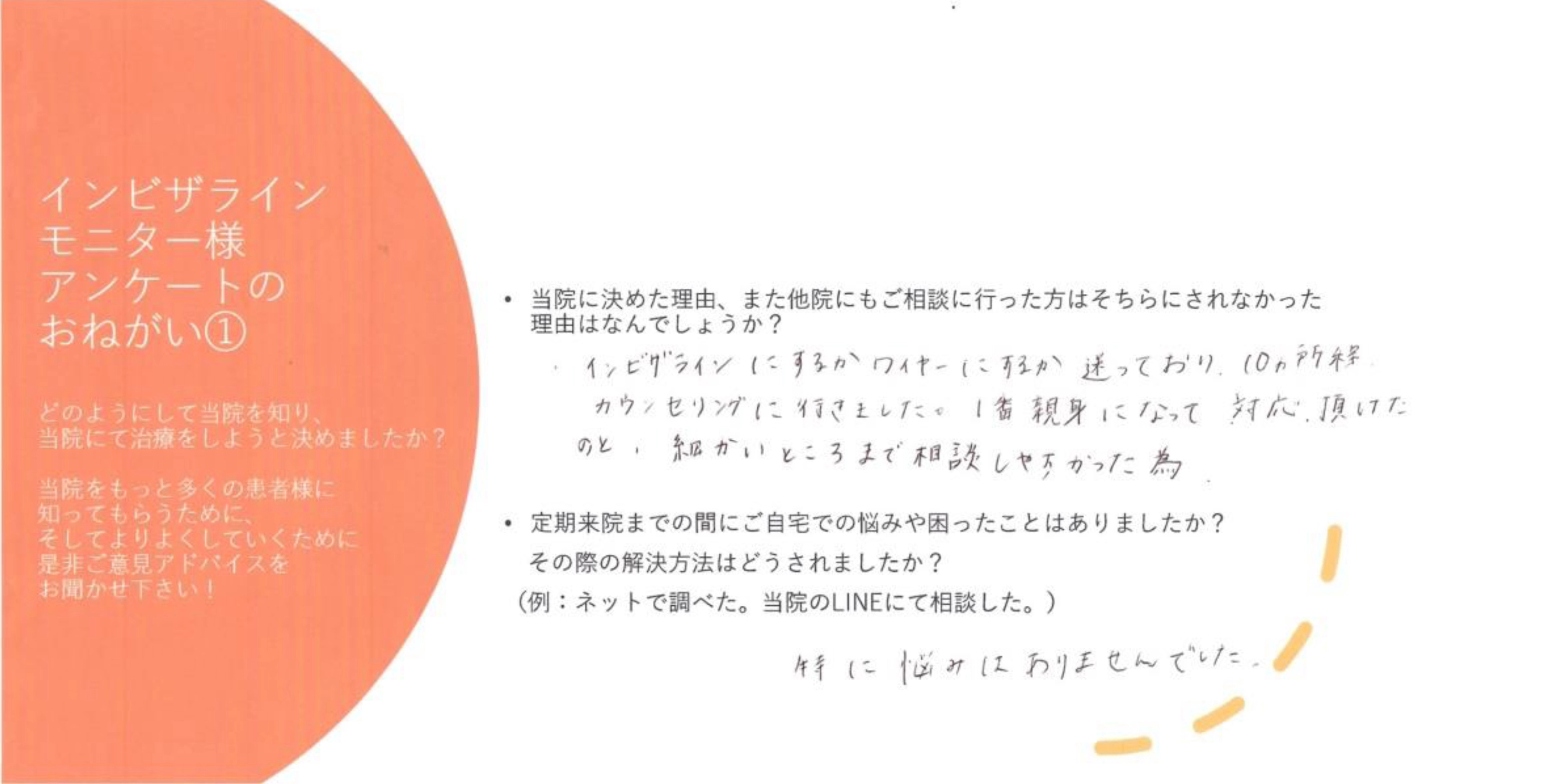 ¥300,000~¥700,000(税別) モニター患者様には、当院ホームページやSNS、院内での他の患者様へのご説明用にお写真をご使用させていただく場合がございます。(顔写真は使用しません) ※抜歯症例でもモニターの対象となります ※骨切り等が必要になる難症例はモニターの対象外となります お電話やメールでのお問い合わせは診断ができません。ご予約後直接ご来院いただき、矯正の診断を受けられることをお勧めいたします。 |